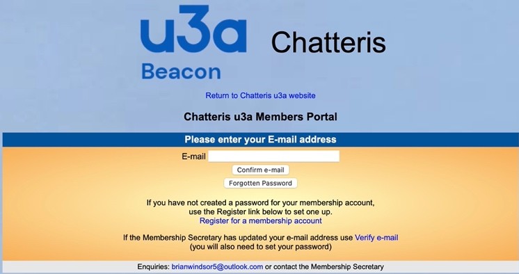 To register for the member’s portal - You will need the information listed below. It is worthwhile gathering this information before starting the registration process.  This information must be exactly as held on Chatteris u3a system and is case sensitive: